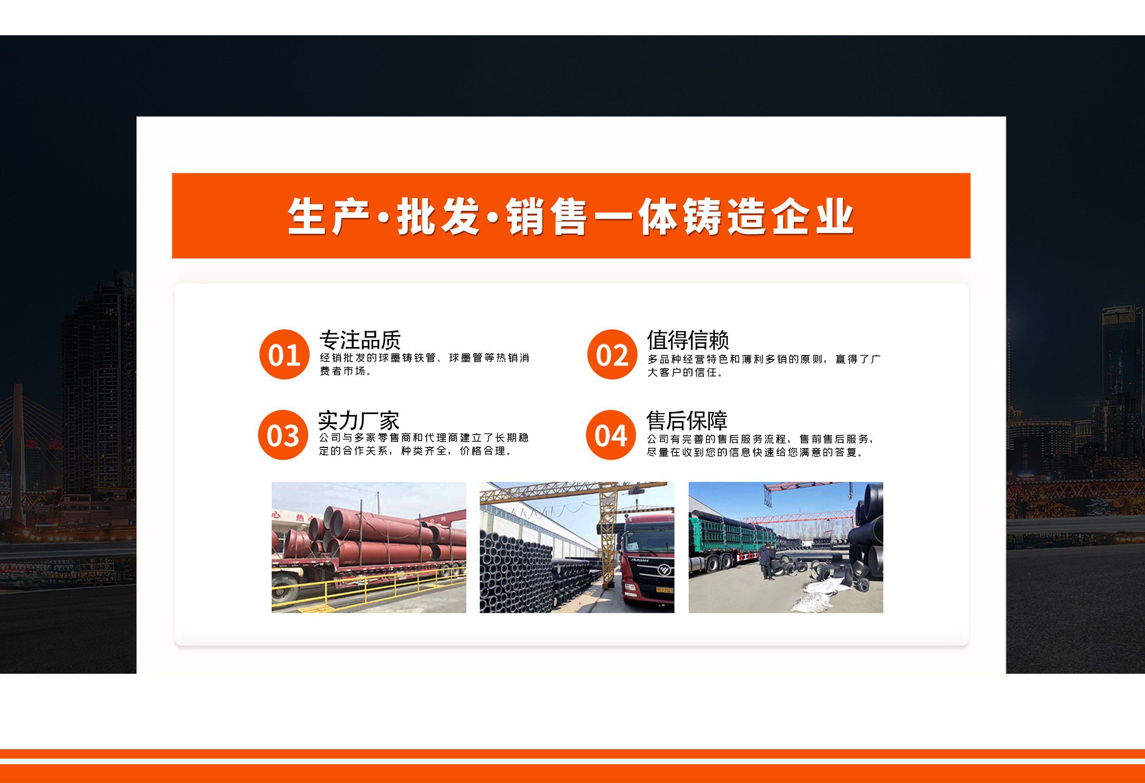 青島金源達(dá)管業(yè)有限公司主要經(jīng)營(yíng)各種規(guī)格球墨鑄鐵管,球墨管,球墨鑄鐵管廠(chǎng)家等產(chǎn)品,質(zhì)量可靠,誠(chéng)信經(jīng)營(yíng),值得信賴(lài)! 青島金源達(dá)管業(yè)有限公司始終堅(jiān)持“誠(chéng)信立業(yè),追求卓越,合作共贏,共同發(fā)展”,竭誠(chéng)歡迎各界朋友來(lái)廠(chǎng)參觀(guān)指導(dǎo),洽談業(yè)務(wù)。我們?cè)概c您攜手共進(jìn),互惠雙贏,共創(chuàng)未來(lái)! 公司堅(jiān)持“以?shī)^斗者為本”的理念,關(guān)心關(guān)愛(ài)職工,職工的獲得感、幸福感更加充實(shí)、更有保障、更可持續(xù);秉承“忠誠(chéng)企業(yè)、勇于擔(dān)當(dāng)、開(kāi)拓創(chuàng)新、主動(dòng)作為”,堅(jiān)持黨建領(lǐng)航、創(chuàng)新驅(qū)動(dòng)、文化塑魂、奉獻(xiàn)社會(huì),全面致力于綠色、低碳、高效、高質(zhì)量發(fā)展。 愿與各界朋友攜手并進(jìn),共創(chuàng)未來(lái)!...